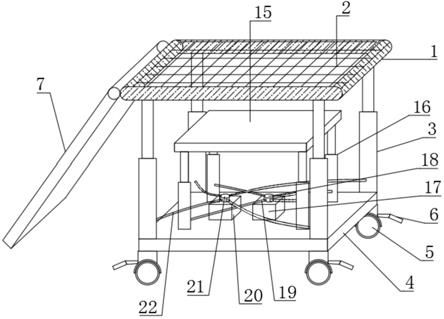 22.本实用新型提供了一种复合型宠物针灸床,包括床架1、支腿3、底座4,所述支腿3一端与床架1连接,另一端与底座4连接,所述底座 4下方设有走轮5,所述床架1上设有网格状的床面2,床架1侧面铰接有搭板7,所述搭板7长度可伸缩。