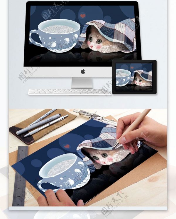 简约 清新 萌 宠 系列 猫咪 插画 蓝色 杯子 绘画 公众号配图 配图