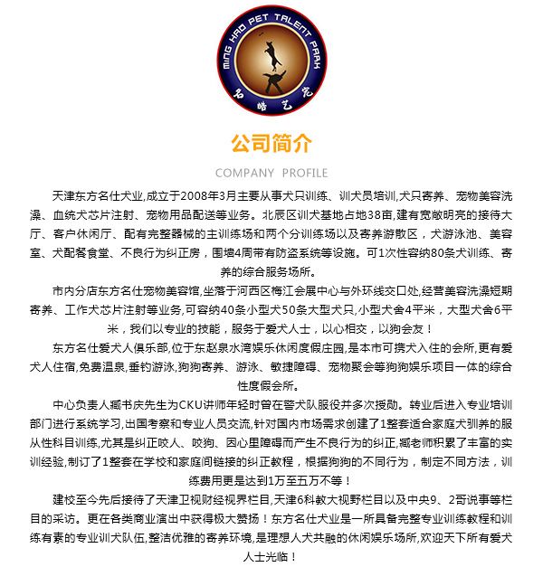 天津东方名仕犬业,成立于2008年3月主要从事犬只训练、训犬员培训,犬只寄养、宠物美容洗澡、血统犬芯片注射、宠物用品配送等业务。