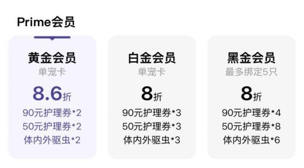 具体来说,宠物家的会员分为三个等级,黄金、白金、黑金,分别按照199、299、599一年收费,不同会员的权益区别主要体现在护理代金券的张数和驱虫的次数,以及护理折扣和预约天数上,所有的会员都可以享受进口贝特爱思宠物浴液,也都能升级带星的护理美容师。