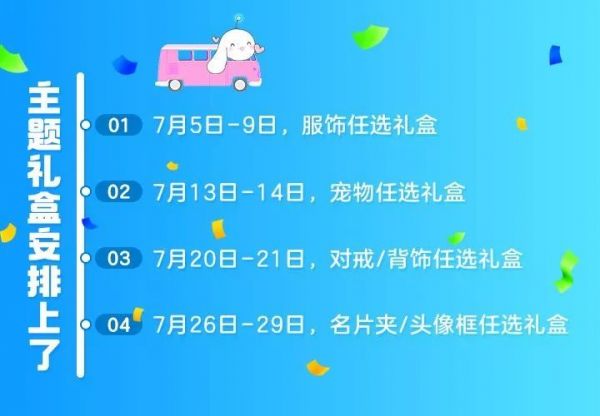 听说这次的盛夏派对可是福利全开,7月每周都将有不同主题的任选礼盒上线,时装、宠物、对戒、背饰、名片夹、头像框...奖励多多high翻了~