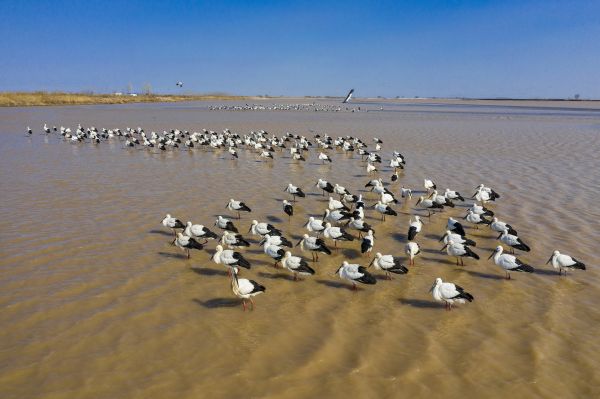 2022年2月16日,山东垦利区黄河口镇黄河主河道。黄河口被誉为鸟类迁徙的“国际机场”。东方白鹳是国家一级保护动物,自2003年首次在黄河口自然保护区湿地内废弃电线塔上繁殖以来,已连续20年在黄河口野外自然繁殖,累计繁育2748只,东营是全球最大的东方白鹳自然繁殖地。胡友文 摄