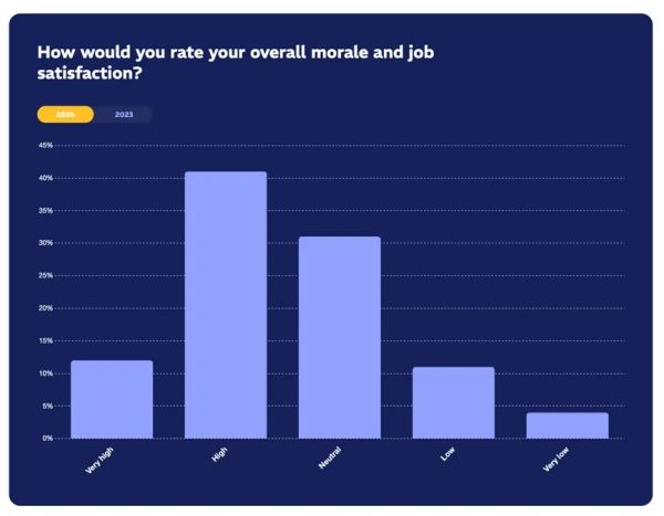 今年在士气方面有令人鼓舞的消息。虽然人员流动和配备问题仍然存在,但54%的受访者表示士气高涨或非常高涨,高于2023年的34%。更令人鼓舞的是,报告士气低落的受访者人数从21%下降到11%。
