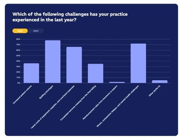 人员配备仍然是一个关键问题,但在这方面也看到了一些进展。大多数受访者(78%) 仍然认为人员短缺是他们面临的最大挑战,但这比2023年报告的86%有所下降。这一微小但有意义的改进表明,一些动物医院在处理其劳动力需求方面做得越来越好。