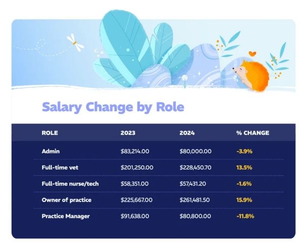 薪酬变动因职位而异。全职兽医和动物医院所有者的工资分别大幅增长了13.5%和15.9%,而动物医院经理的降幅最大,与2023年相比下降了11.8%。这些趋势凸显了领导职位的薪酬不断上升,但管理和支持人员仍面临挑战。