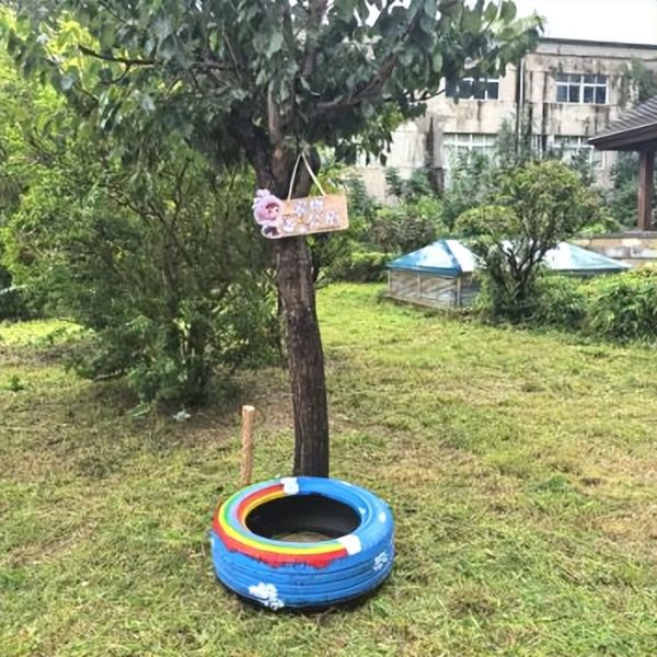接到“楼栋小主人”的反馈后,社区第一时间开展实地调研,确认宠物粪便问题的普遍性与紧迫性。为践行环保理念、降低项目成本,社区主动对接辖区“海棠商盟”商家,说明小区治理需求,最终成功获赠2个闲置轮胎,作为制作宠物厕所的原材料。随后,5名“楼栋小主人”组成“宠物厕所改造小组”,全程主导设计与制作——在小海小棠工作人员的安全指导和帮助下,孩子们分工协作,有的打磨轮胎边缘,有的绘制创意图案,有的安装配套设施,原本废弃的轮胎摇身一变,成为美观又实用的宠物厕所。