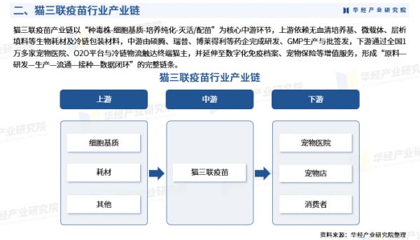 猫三联疫苗产业链以“种毒株-细胞基质-培养纯化-灭活/配苗”为核心中游环节,上游依赖无血清培养基、微载体、层析填料等生物耗材及冷链包装材料,中游由硕腾、瑞普、博莱得利等药企完成研发、GMP生产与批签发,下游通过全国1万多家宠物医院、O2O平台与冷链物流触达终端猫主,并延伸至数字化免疫档案、宠物保险等增值服务,形成“原料—研发—生产—流通—接种—数据闭环”的完整链条。