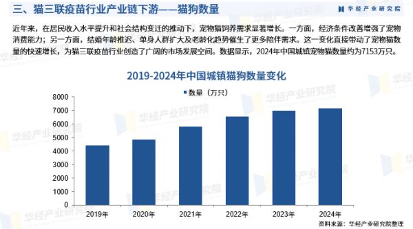 近年来,在居民收入水平提升和社会结构变迁的推动下,宠物猫饲养需求显著增长。一方面,经济条件改善增强了宠物消费能力;另一方面,结婚年龄推迟、单身人群扩大及老龄化趋势催生了更多陪伴需求。这一变化直接带动了宠物猫数量的快速增长,为猫三联疫苗行业创造了广阔的市场发展空间。数据显示,2024年中国城镇宠物猫数量约为7153万只。