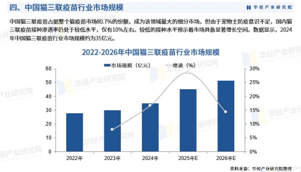 中国猫三联疫苗占据整个猫疫苗市场80.7%的份额,成为该领域最大的细分市场。但由于宠物主防疫意识不足,国内猫三联疫苗接种渗透率仍处于较低水平,仅有10%左右。较低的接种水平预示着市场具备显著增长空间。数据显示,2024年中国猫三联疫苗行业市场规模约为35亿元。