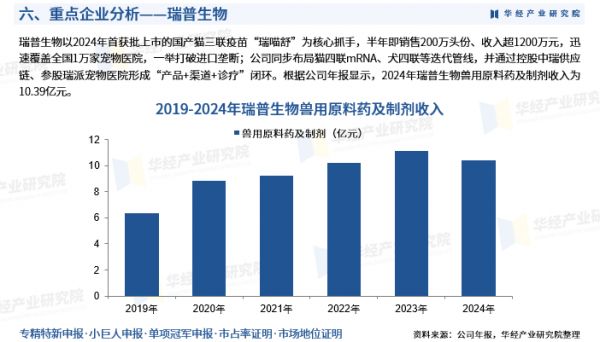 瑞普生物以2024年首获批上市的国产猫三联疫苗“瑞喵舒”为核心抓手,半年即销售200万头份、收入超1200万元,迅速覆盖全国1万家宠物医院,一举打破进口垄断;公司同步布局猫四联mRNA、犬四联等迭代管线,并通过控股中瑞供应链、参股瑞派宠物医院形成“产品+渠道+诊疗”闭环。根据公司年报显示,2024年瑞普生物兽用原料药及制剂收入为10.39亿元。