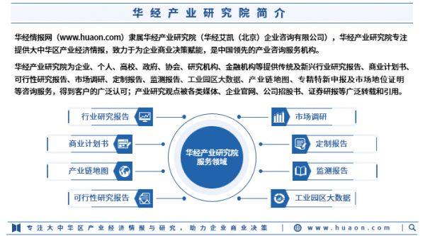 华经情报网隶属于华经产业研究院,专注大中华区产业经济情报及研究,目前主要提供的产品和服务包括传统及新兴行业研究、商业计划书、可行性研究、市场调研、专题报告、定制报告、工业园区大数据、产业链地图、专精特新申报、小巨人申报、市场地位证明等。涵盖文化体育、物流旅游、健康养老、生物医药、能源化工、装备制造、汽车电子等领域,还深入研究智慧城市、智慧生活、智慧制造、新能源、新材料、新消费、新金融、人工智能、“互联网+”等新兴领域。