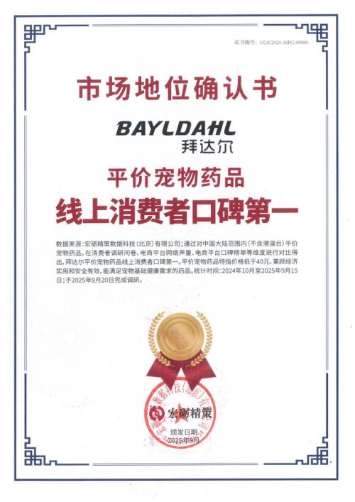2025年9月,经过严谨的独立调研与权威数据验证,拜达尔凭借其在线上销售市场中表现卓越,荣获宏砺精策颁发的“平价宠物药品线上消费者口碑第一”市场地位确认书。