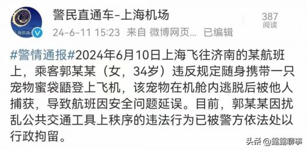 根据上海市公安局国际机场分局的通报,女乘客名叫郭某,34岁。她因携带宠物蜜袋鼯登机并导致航班延误,已被警方依法处以行政拘留。除了这一处罚,郭某可能还面临罚款和赔偿,毕竟飞机的延误对机场、航司以及乘客造成了直接的经济损失。