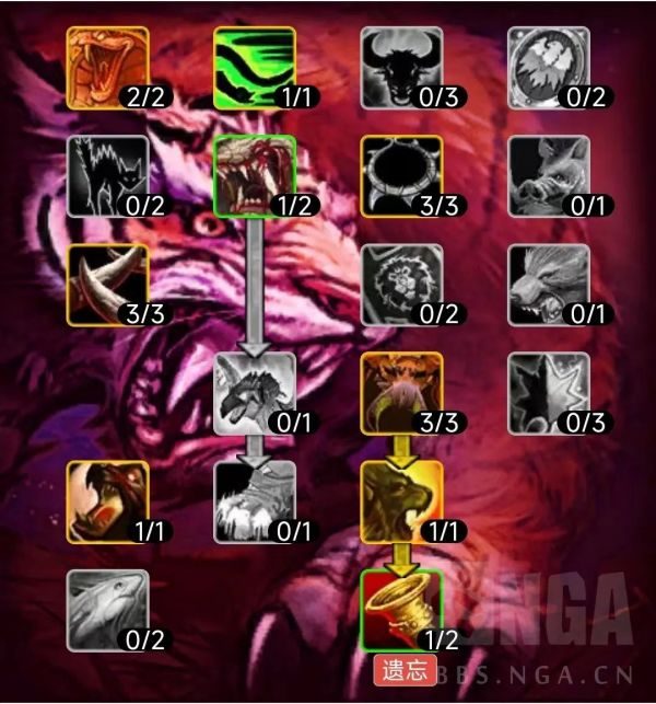 如果团队不需要猎人出电池(PS:暗牧的吸血鬼之触、惩戒骑的智者审判与生存猎的电池效果相同),也可以像冬雨大佬一样,开荒奥杜尔时将2点狩猎小队和1点瞄准射击挪到兽王系的强化雄鹰守护。同时,P4阶段由于装备提供的命中不足而暴击有时会溢出,也可以根据自身情况在夺命射击和专注瞄准之间进行取舍。