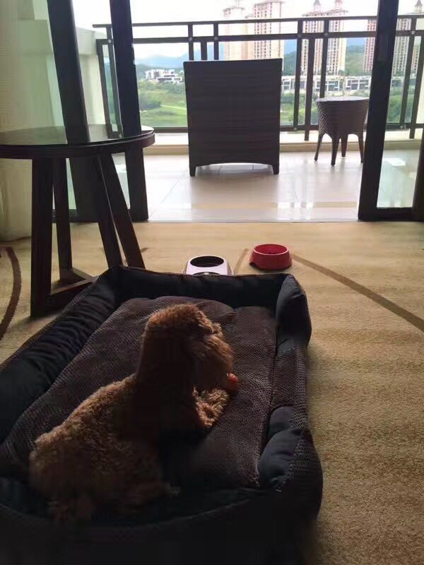 带狗窝,住酒店的时候狗睡窝里,不会乱叫。晚上在外面撒完尿再回酒店睡觉(平常在家也是这样晚上到外面撒完尿再睡觉),出去玩的时候带上它不让它单独在酒店。