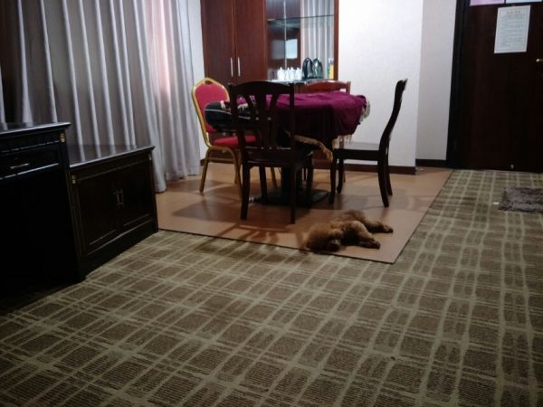 五一带它去旅游住的酒店,天气太热喜欢睡瓷砖地板