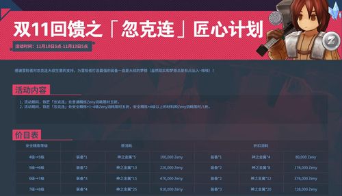 1、活动期间,铁匠「忽克连」处普通精炼Zeny消耗限时五折。