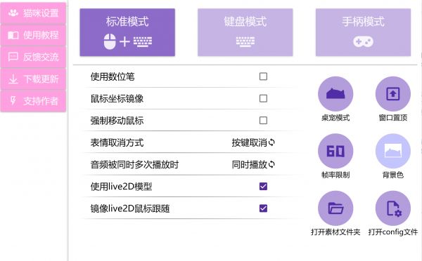 2. 窗口设置 位置调整:Bongocat 启动后,会出现在屏幕上,默认位置可能不太符合你的心意。你可以通过鼠标左键按住 Bongocat 的窗口,将其拖动到你想要的位置,比如屏幕的角落或任意空白区域。大小改变:若觉得 Bongocat 窗口过大或过小,在窗口上右键点击,选择 “改变大小” 选项,然后通过拖动鼠标来调整窗口大小。也可以使用快捷键(如 Ctrl + 右键拖动,具体快捷键可查看软件帮助文档)来更方便地调整大小。窗口置顶:为了确保 Bongocat 不会被其他窗口遮挡,你可以在 Bongocat 窗口的右键菜单中,选择 “窗口置顶” 选项,这样它就会始终显示在屏幕最前端。 3. 模式选择:Bongocat 有多种模式可供选择,以适应不同的使用场景。 标准模式:这是最常见的模式,Bongocat 会跟随你的鼠标移动而舞动,当你点击鼠标时,它也会做出相应的动作,比如拍手、敲击等。键盘模式:在该模式下,Bongocat 主要对键盘操作做出反应。你按下键盘上的按键,它会模拟敲击键盘的动作,非常适合在打字、玩游戏等需要频繁使用键盘的场景中使用。手柄模式:如果你连接了游戏手柄,选择手柄模式,Bongocat 会根据手柄的操作做出对应的动作,让你在使用手柄玩游戏时也能有可爱的桌宠陪伴。在 Bongocat 窗口的右键菜单中,找到 “模式” 选项,点击后选择你想要的模式即可切换。五、互动与功能体验
