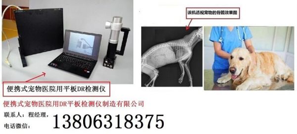 威海市便携式宠物医院用平板DR检测仪制造有限公司,联系人:程经理,电话微信;13806318375,生产和销售;便携式宠物医院用平板DR检测仪,该机售价:35万元,保修一年,终身维护。(诚招全国代理商)。该机用途:小型动物:猫,狗,鼠,兔等动物的体检,骨折检查,怀孕,误食等情况的无损检测。该机优点:1,轻便,可携带。2,无需暗室直接在电脑上成像。3.该机辐射低,无需建铅房。4,该机判断准确。5,该机易于维护保养。该机的性能和参数:X射线成像系统