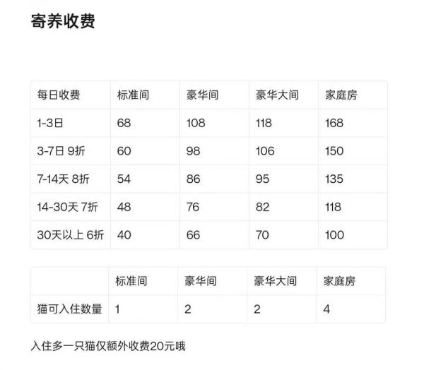 “肥瞄瞄”告诉记者,目前宠物平时寄养起步价68元/天,国庆节涨价30元/天,一共为98元/天。她会早晚为猫咪换水换粮各1次,铲屎2次,消毒2次。店里采用温控木质猫柜和散养结合的形式,空间比较大,有专门供猫咪玩耍的游乐区,所以每天下午还会跟每只猫互动1小时,一天会给猫拍3次视频,同步给主人。