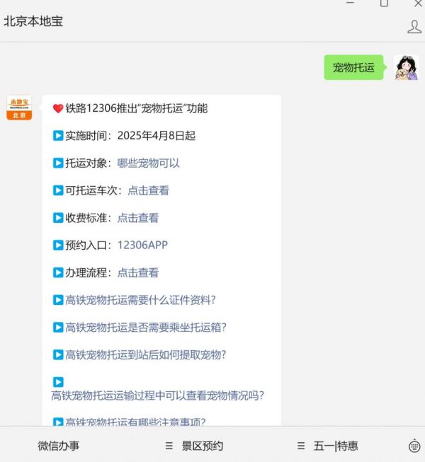 温馨提示:微信搜索关注公众号【北京本地宝】,关注后回复【宠物托运】获高铁宠物托运预约入口、预约办理流程、怎么收费、哪些狗狗可以办理托运、托运车次、托运所需资料、托运注意事项、如何提取宠物等。