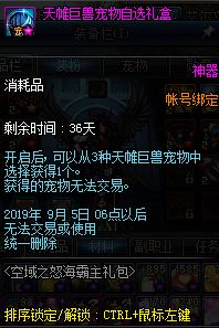 目前体验服当中空域之怒海霸主礼包上架发售,价格是19900点券,该礼包当中包括了DNF天帷巨兽宠物自选礼盒,开启后得到DNF天帷巨兽宠物。
