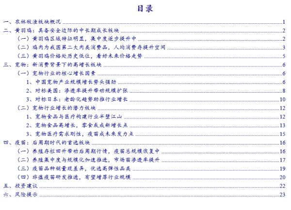 本报告跳出农业的周期属性,从消费、成长角度阐述未来投资机会,主要包括黄羽鸡、宠物、动物疫苗三个部分。黄羽鸡部分从行业特征、消费状态、价格走势三个方面分析;宠物部分首先基于行业本身的增长情况,探讨未来增长因素以及潜力板块;动物疫苗是养殖后周期时代下的成长板块,从四个方面阐述投资机会。基于上述三个方面的详细论述,我们认为黄羽鸡、宠物食品、动物疫苗具备投资价值,并给出相关个股推荐。