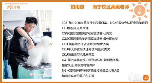 资质与荣誉:派多格讲师,2014 年进入宠物行业担任校区宠物美容教学老师,2015 年开始前往日、韩进修;获 WPA - A 级专业组全场第1名、WPA - M 级专业组全场季军;拥有 CKU、NGKC 高级美容师称号;具备 7 年自主品牌门店运营管理经验。