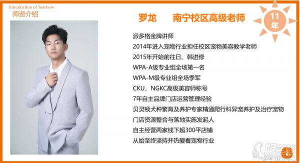 资质与荣誉:罗龙老师是派多格讲师,自 2014 年进入宠物行业担任校区宠物美容教学老师以来,已在教学岗位上深耕多年,教学经验丰富。2015 年,他还前往日、韩进修,学习国外先进的宠物美容、养护理念与技术,并将其融入到日常教学中,为学员带来更前沿的专业知识。在专业赛事方面,他曾获 WPA(世界宠物协会)-A 级专业组全场第 1 名、WPA-M 级专业组全场季军,实力不容小觑。同时,他拥有 CKU、NGKC 高级美容师称号,专业资质过硬。此外,罗龙老师还具备 7 年自主品牌门店运营管理经验,对宠物门店的经营管理有着独到的见解和丰富的实践经验。