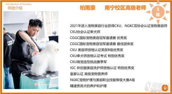 资质与荣誉:柏雨豪老师自 2021 年进入宠物美容行业以来,凭借出色的天赋和不懈的努力,迅速成长为行业内的佼佼者。他是 CKU、NGKC 双协会认证宠物美容师,同时还是 CKU 协会认证牵犬师,多领域的认证彰显了他的全能实力。在各类专业赛事中,他也屡获佳绩,曾获 CGGC 国际宠物美容邀请赛优秀奖、优佳团体奖,CKU 美容师资格认证 B 级优秀奖,CKU 牵犬师资格认证考试特别优秀奖,CKU 萌宠造型挑战赛季军,IGC 伴侣猫美容洗护师资格认证特别优秀奖等多项荣誉。此外,他还拥有皇家认证高级宠物营养师资质,且达到 NGKC 宠物护理与美容职业技能等级大赛 A 级水平,在宠物美容、牵犬、营养护理等方面都具备极高的专业水准。