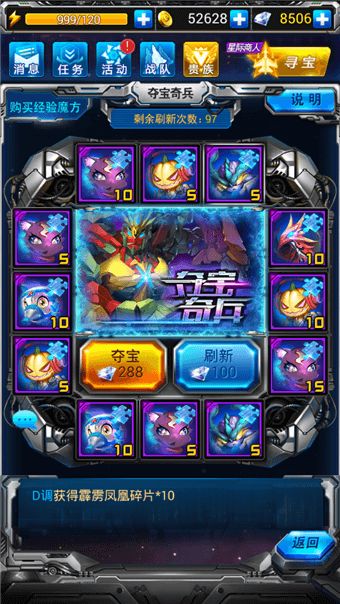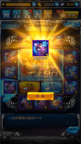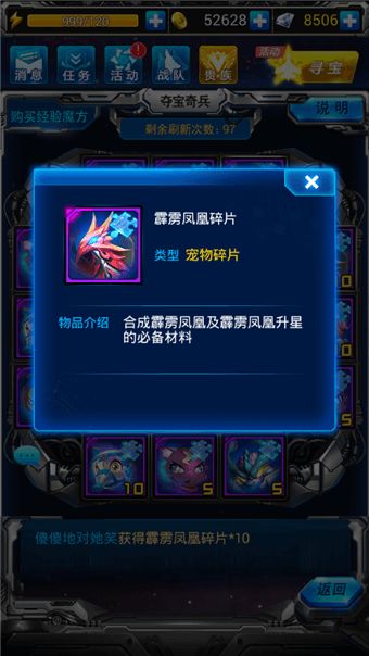在活动期间,夺宝奇兵开启宠物专场的玩法,其中最豪华的奖励为机甲龙碎片与霹雳凤凰碎片。在一轮大转盘上抽满12次,即可拿光所有转盘上的奖励,大转盘每晚3点重置。