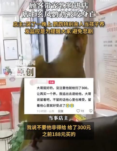 当事店主回应记者称,当天哭了一晚上,已经把鹦鹉当成孩子养了,当时宠物狗咬穿了鹦鹉心脏,顾客给了300元赔偿。