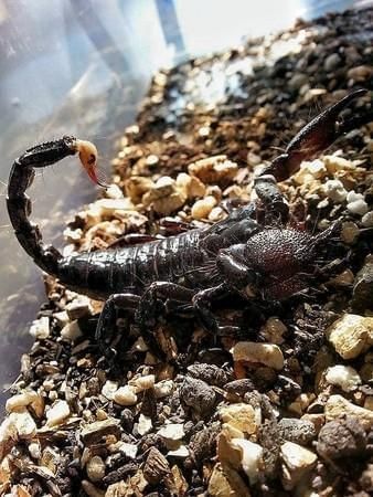 ▲帝王蝎:属于蛛形纲蝎目,具有4对步足,在后腹部最末一节为带有毒刺的尾节,制造毒液,由毒针释放毒液,是夜行性、肉食动物。帝王蝎是世界上体型最大的蝎子之一,全长约20-30公分,生活在非洲西部热带雨林底层和草原边缘,夜间捕食其他节肢动物和小型两栖爬虫类。