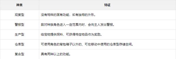 有观赏用途的宠物,有代为保管道具的仓库用宠物,用途多样。
