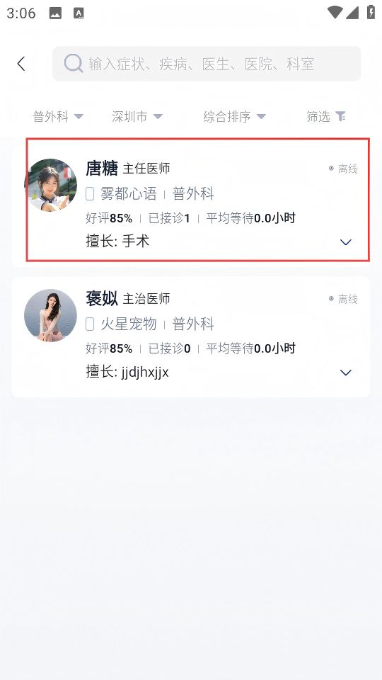 3、在普外科医生列表中,点击要咨询的医生,进入医生详情页。