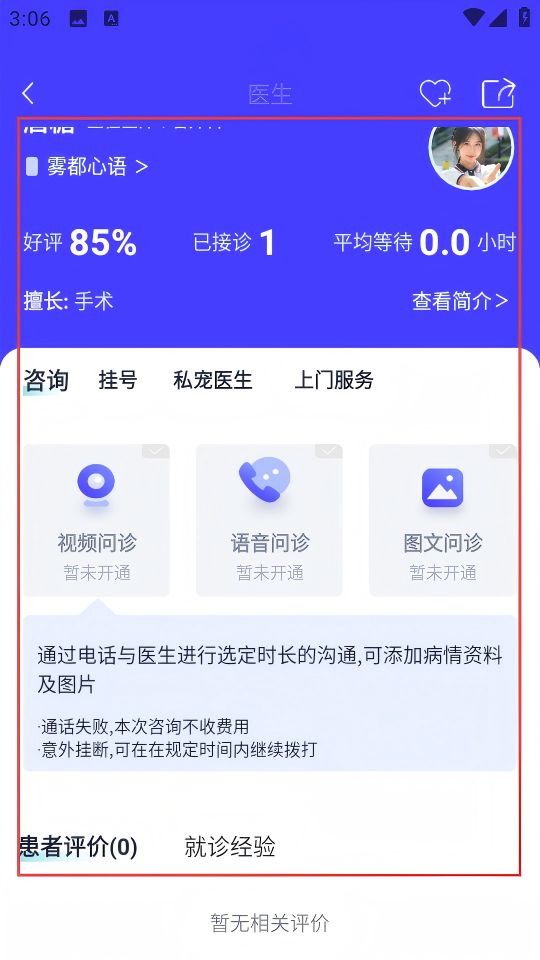 4、在医生详情页,可查看医生好评率、已接诊数等信息,还能选择问诊方式进行咨询。