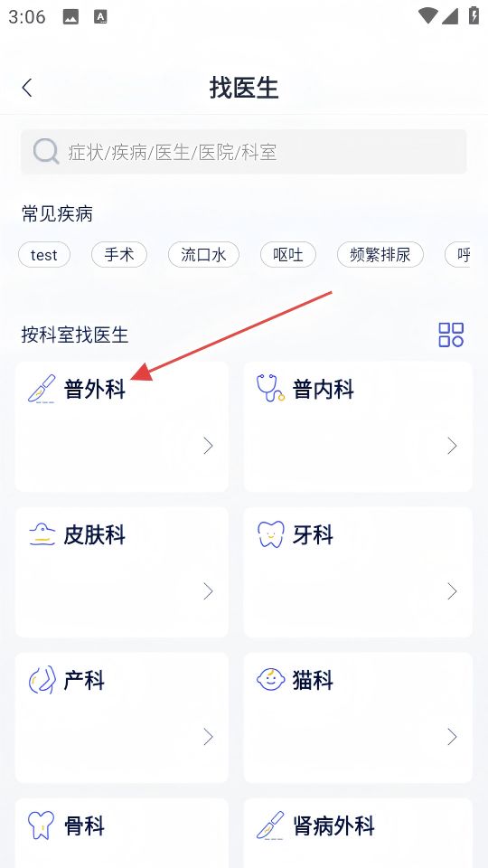 2、在找医生页面,点击【普外科】科室,进入普外科医生列表。