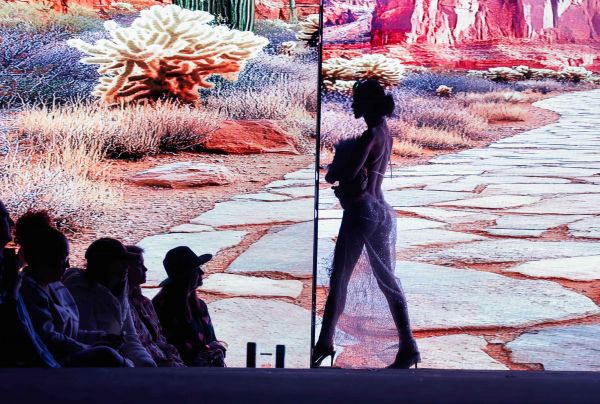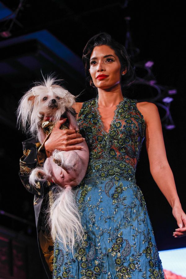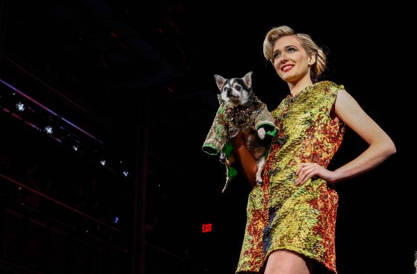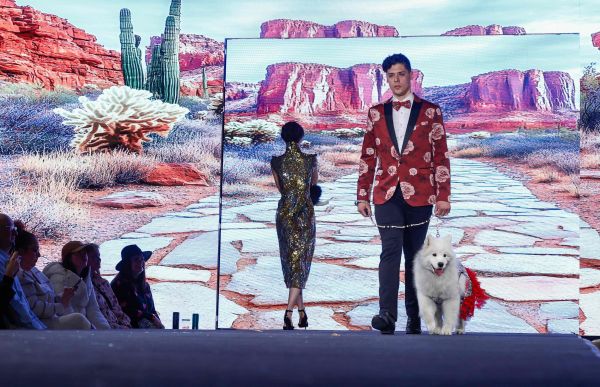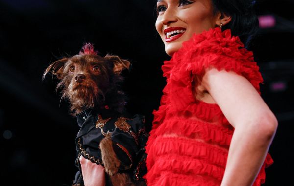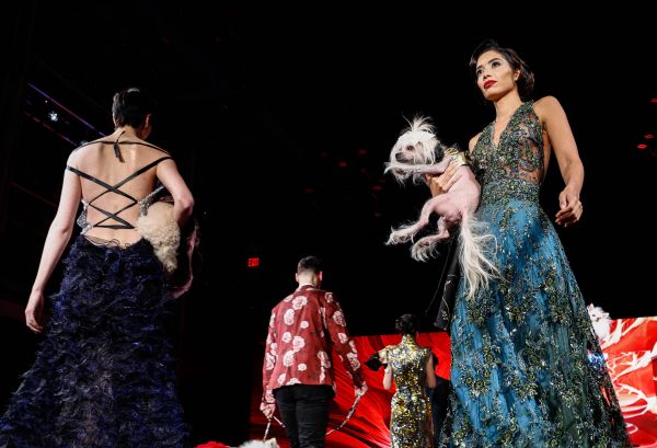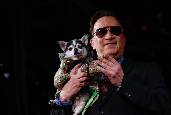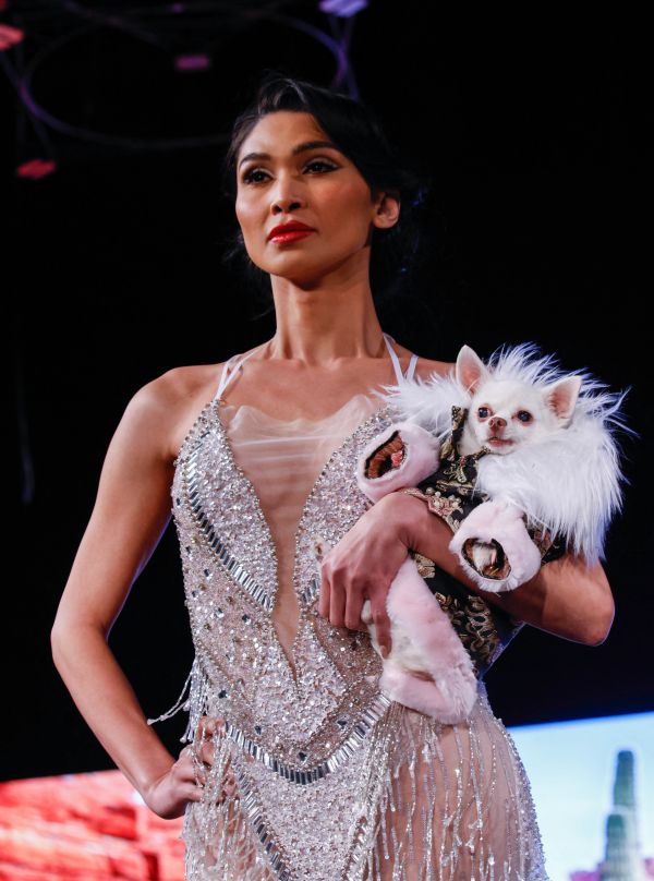 2月8日,在美国纽约,时装设计师安东尼·鲁比奥带着宠物狗亮相纽约时装周的安东尼·鲁比奥2025秋冬宠物服饰秀。新华社/法新
