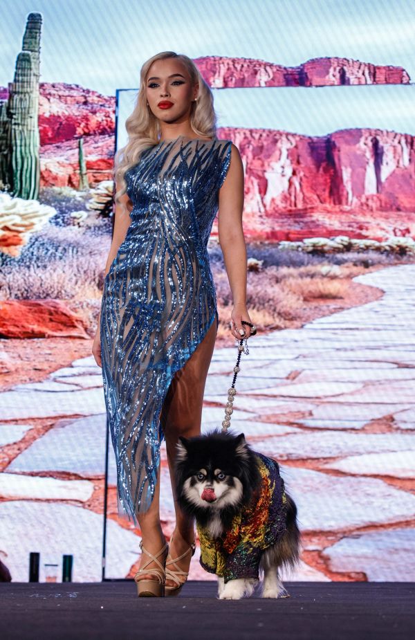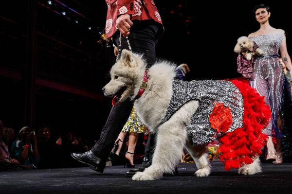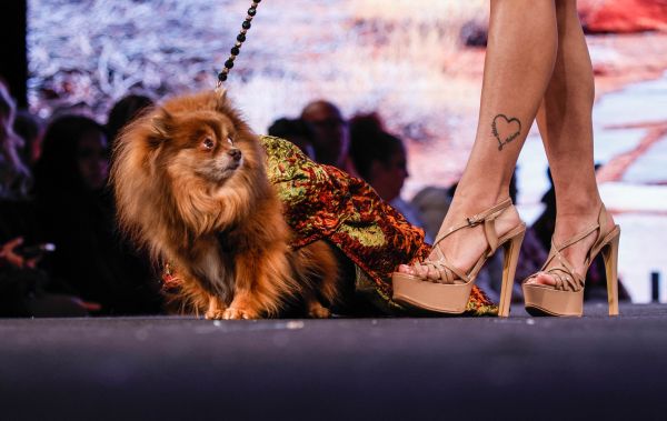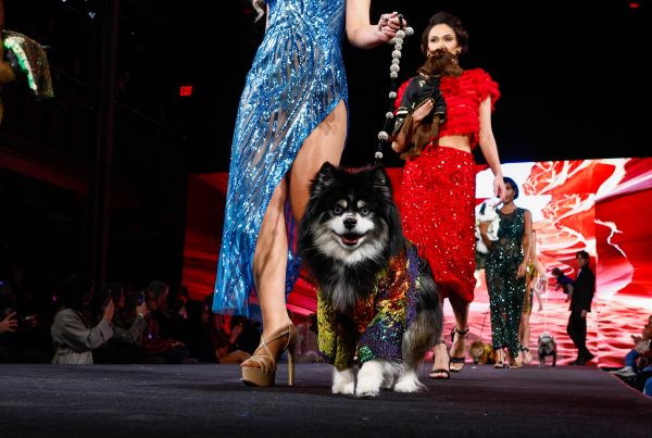 2月8日,在美国纽约,模特带着宠物狗亮相纽约时装周的安东尼·鲁比奥2025秋冬宠物服饰秀。新华社/法新