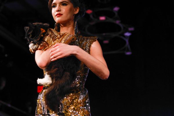 2月8日,在美国纽约,模特带着宠物猫亮相纽约时装周的安东尼·鲁比奥2025秋冬宠物服饰秀。新华社/法新