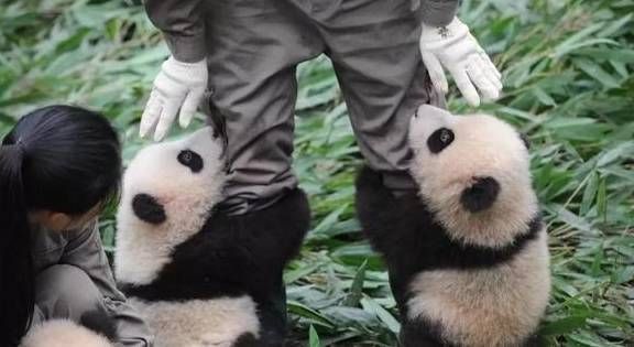 被两个萌萌哒的熊猫宝宝抱大腿