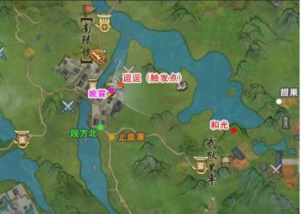 3、交谈结束后,寻找【段方北】,并在三岔路处采集止血草,随后带回到【段方北】处为其处理伤口。