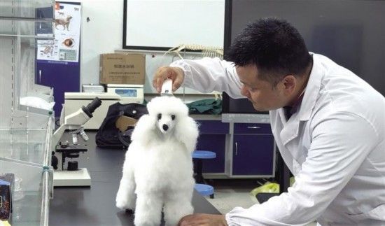 七月十一日,在西安職業技術學院生物與醫藥學院,該校教務辦主任楊蒙在實驗室現場演示寵物修剪技術(資料照片)。