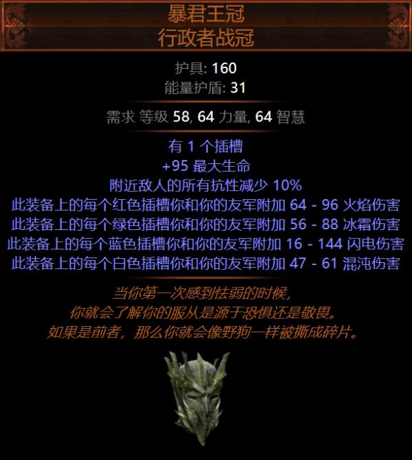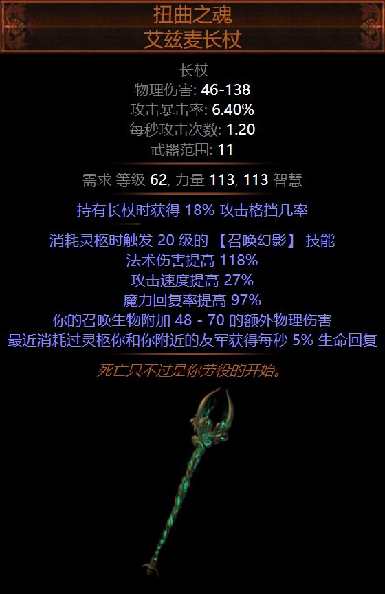下图中所展示的物品名字为“威能混乱共振器”,拥有该通货,你就可以将重置一件装备的属性词缀,重置后的装备必定不带有魔力、生命、物理类型的词缀,且会有更高的概率获得移速、闪电、召唤生物词缀!