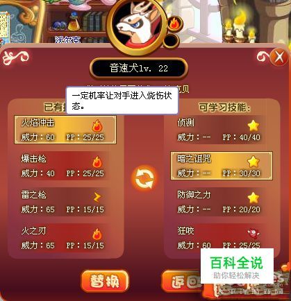 火系宠物的技能 火系宠物技能:属于《洛克王国》15种魔法攻击类型之一。 火之刃:一定几率让对手进入烧伤状态或恐惧状态,两效果不可同时出现。威力:65,PP15。 爆击枪:一定几率让对手进入烧伤状态。威力:45,PP25。 爆炎拳:提高暴击率,一定几率让对手进入烧伤状态。威力:85,PP10(眩目鸡) 火焰踢:一定几率让对手进入烧伤状态。威力75,PP15(眩目鸡)。 火焰喷发:一定几率让对手进入烧伤状态。威力95,PP15。 火焰漩涡:令对手陷入烧伤状态,2~5回合无法更换宠物。威力15,PP15。 热力爆弹:一定几率让对手进入烧伤状态。威力100,PP10。 火焰冲击:一定几率让对手进入烧伤状态。威力60,PP25。 练级技能推荐:火系宠物技能的特点是在造成高伤害的同时,还能附带特殊效果(即烧伤状态),这在快速战斗中具有非常大的优势,可以说,如果碰到自己所能克制的宠物时,火系宠物所产生的伤害是最高的,不过,因为具有了高的攻击力,在生存能力方面,相对草系、水系等宠物来说就会低一些。因此,在练级时,大家只需要选择威力最高的技能,以求能够对对手造成一击必杀,从而减少自己练级的损失。火系宠物技能