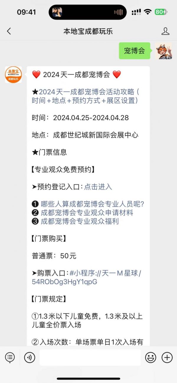 温馨提示:微信搜索公众号【本地宝成都玩乐】,回复【宠博会】即可查看成都宠博会免费预约入口、购票入口、开展时间,了解现场展商分布、舞台活动安排,还可了解专业观众定义、福利、申请材料规定。