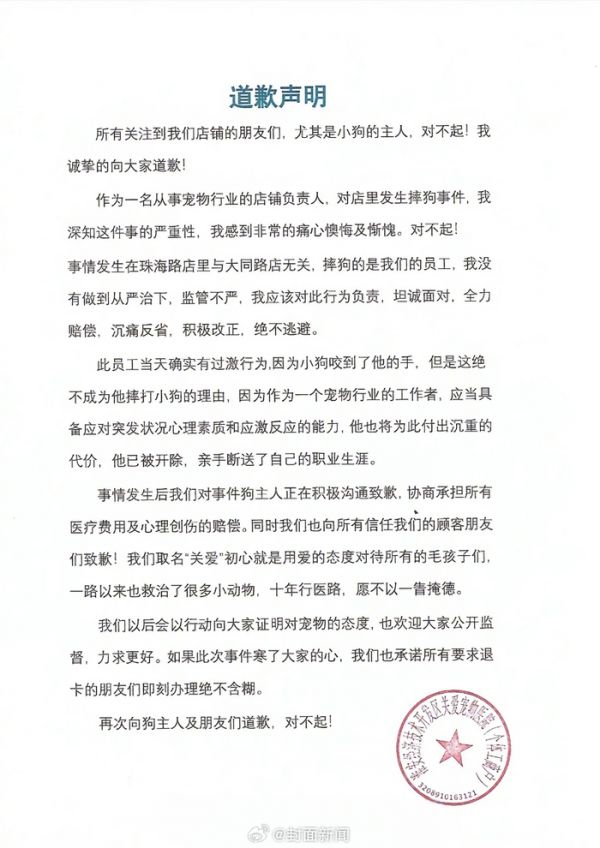 时间:2025-10-15 21:02【#暴力摔狗宠物医院道歉#:涉事员工已被开除】#宠物医院暴力摔狗员工已被开除# 近日,江苏淮安一宠物医院工作人员暴力摔狗视频,引发关注。4月21日,涉事宠物店发布道歉声明:“员工当天确实有过激行为,因为小狗咬到了他的手,但是这绝不成为他摔打小狗的理由,因为作为一个宠物行业的工作者,应当具备应对突发状况心理素质和应激反应的能力,他也将为此付出沉重的代价,他已被开除,亲手断送了自己的职业生涯。事情发生后我们对事件狗主人正在积极沟通致歉,协商承担所有医疗费用及心理创伤的赔偿。”