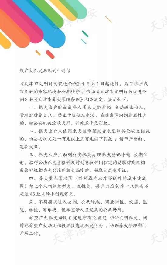 市养犬管理办公室负责同志:广大市民如发现不文明养犬行为,可以拨打110举报,公安机关将依法依规处理。同时,就有关政策方面的咨询、涉犬问题的投诉建议,也可以拨打天津市养犬管理办公室电话:022-88292269。