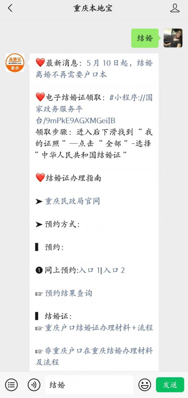 温馨提示:微信搜索公众号【重庆本地宝】,关注后回复【结婚】进入重庆结婚登记微信预约入口,民政局上班时间+电话+地址,哪些民政局周六上班,结婚登记/异地办理材料,登记照尺寸要求,免费婚检医院。