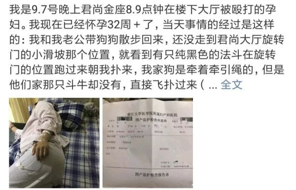 杭州一个怀孕足足8月的孕妇和丈夫牵狗散步回家,另一只没有牵绳的斗牛犬突然朝她身上猛扑,一旁的丈夫为了保护她,用脚将狗赶走。